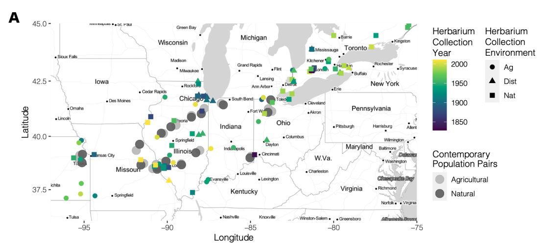 [Now published in Science!] Recently, we have leveraged extensive pairwise natural-agricultural sampling across the range, historical herbarium sequencing, and manipulative common gardens to identify how rapidly agricultural alleles and phenotypes have shifted across contemporary timescales.