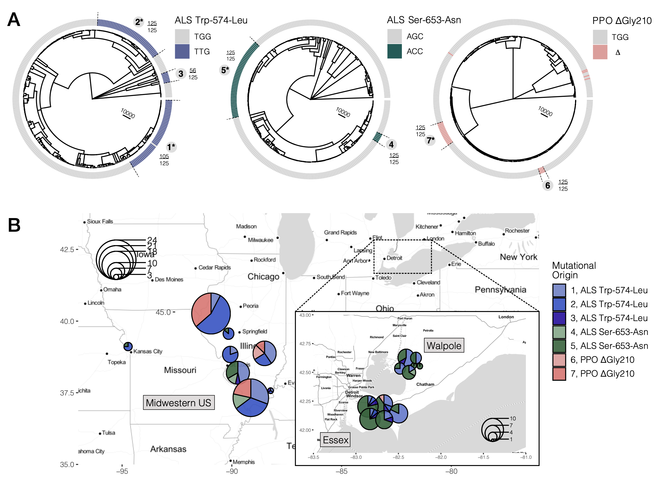 In a paper recently published in eLife, I characterized the repeatability of herbicide resistance evolution, using an increasingly tractable approach in population genomics, tree-sequence reconstruction, that takes into account not just the history of mutation but recombination. Not only did I find parallel evolution of herbicide resistance through changes at 11 distinct amino acids, but this tree reconstruction approach illuminates that 3 of these most common mutations themselves had arisen 7 times (A). By mapping these mutational origins back to the populations each lineage occurs in (B), I was able to decipher a key role of gene flow in the spread of resistance… nearly all mutational origins map to many populations, and most populations contain many mutational origins! Most of these mutational origins occurred after the onset of herbicide use, suggesting that variation for herbicide resistance is young and their persistence depends on herbicide use in these environments. Check out the article for more details on the strength of selection, recent population expansions, and the role of allelic interactions in shaping the distribution of resistance mutations across the range.